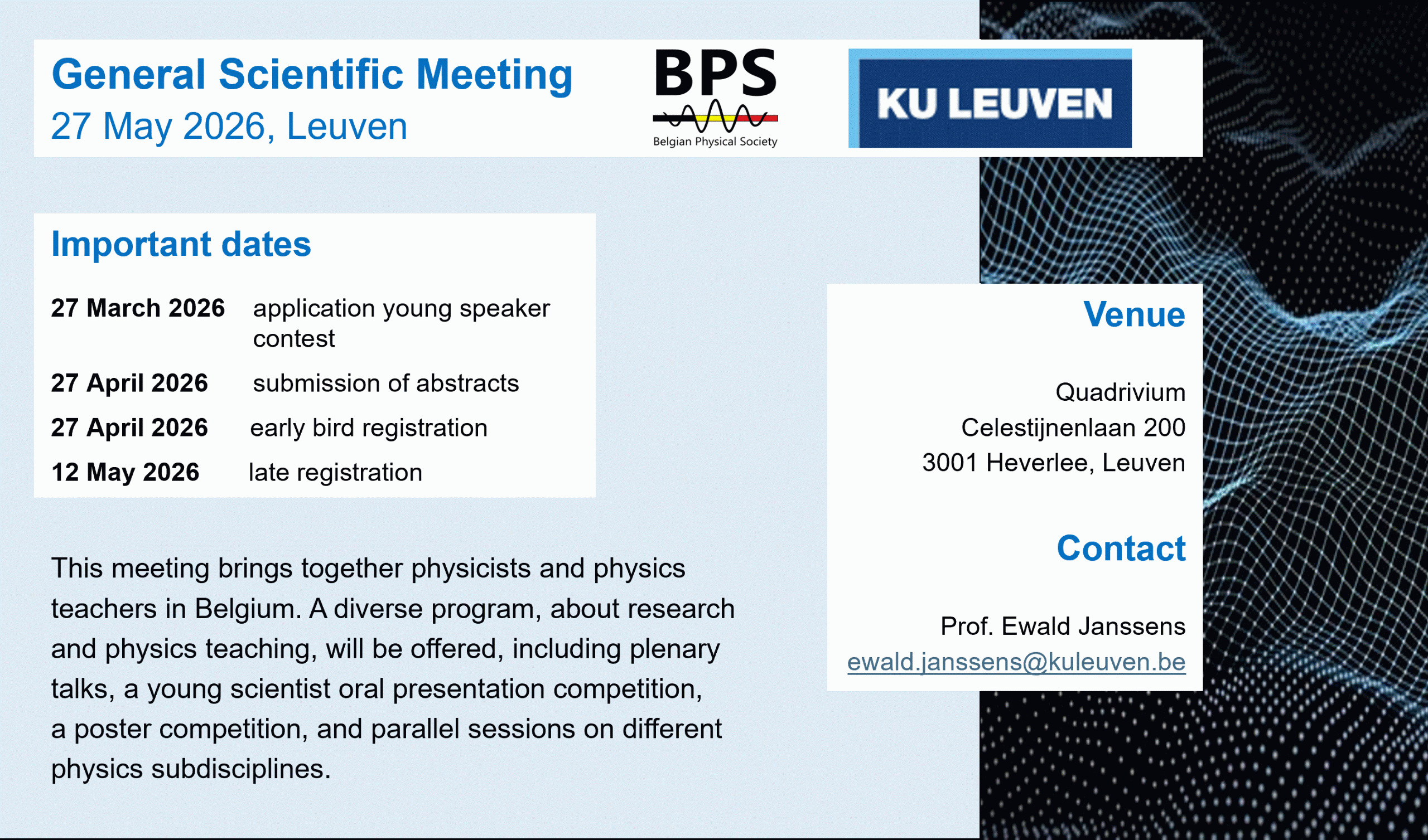 Belgian Physical Society general scientific meeting 2026Website: https://belgianphysicalsociety.be/belgian-physical-society-general-scientific-meeting-2026/